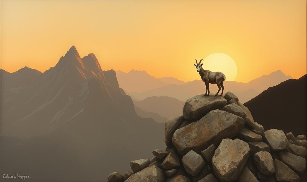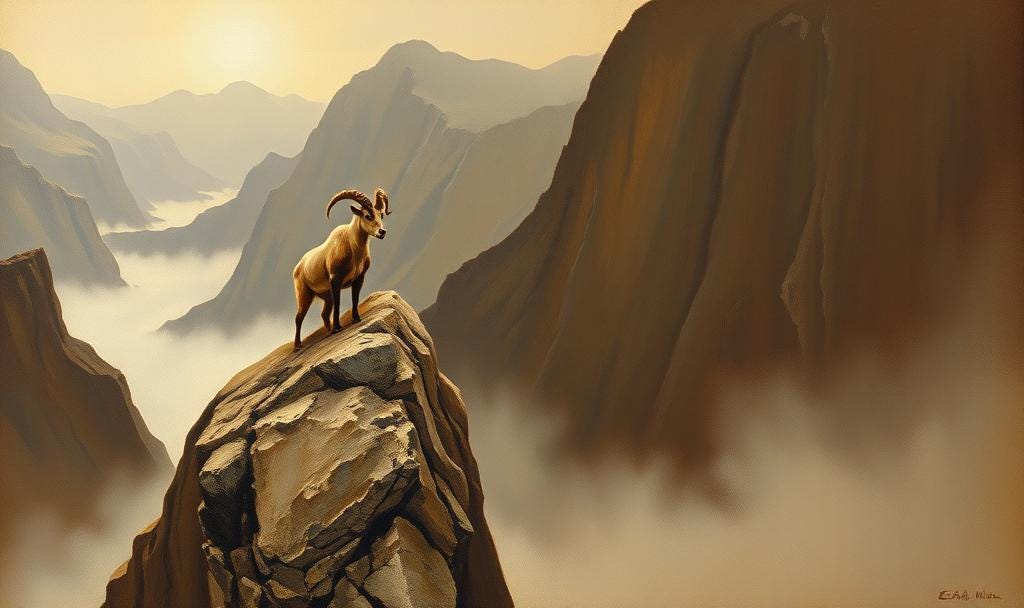 The Mountain Goat, symbolic of Gene Key 52, stands unmoved at great heights. It scales impossible terrain with calm precision. It doesn’t hurry, it doesn't fight gravity - it cooperates with it. In this, it mirrors the strength of restraint and the sacredness of stillness.